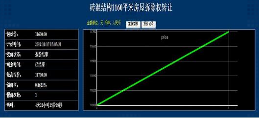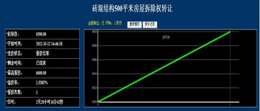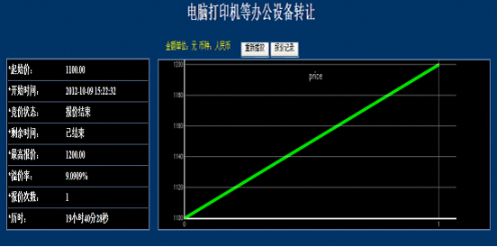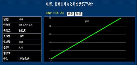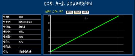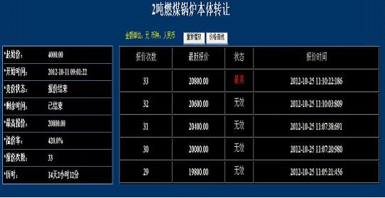 2012年10月25日,我市场对青海省团校一台2吨燃煤锅炉本体进行了成功处置,该资产的评估价为4000元,经过2小时12分、33轮的网络动态报价,最终以2.08万元的价格成交,实现增值1.68万元,增值率达420%。