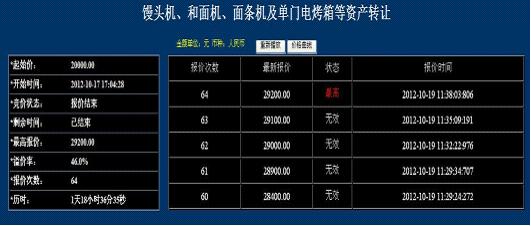 青海省产权交易市场于2012年10月19日对青海省西宁监狱馒头机、和面机、面条机及单门电烤箱等资产进行转让(项目GC12QH030135),经过多轮竞价,评估价为2万元的资产最终以2.92万元成交,增值近万元,增值率达到46%,网络竞价取得圆满成功。