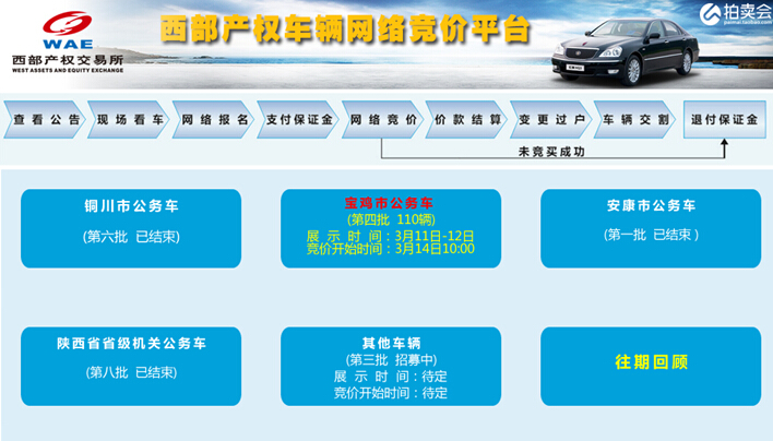 在陕西省启动公车改革以后,西部产权交易所被指定为此次拍卖的车辆处置方。该交易所此前已多次试水网络拍卖。