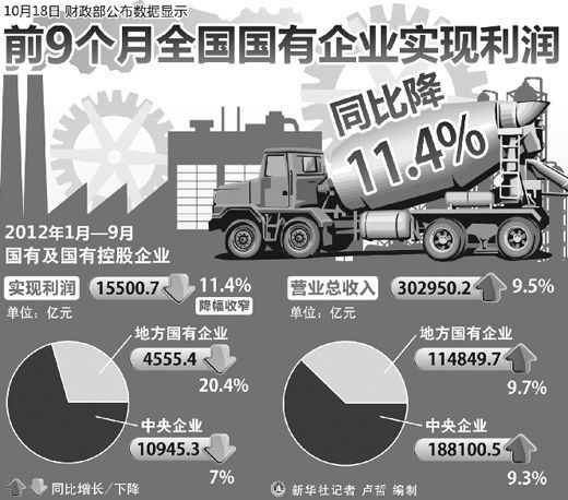 财政部18日公布的数据显示:1—9月全国国有企业营业总收入、应交税费同比增长,实现利润降幅收窄。1—9月,国有企业累计实现营业总收入302950.2亿元,同比增长9.5%;国有企业累计实现利润总额15500.7亿元,同比下降11.4%,9月比8月环比增长2.8%。