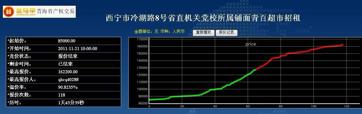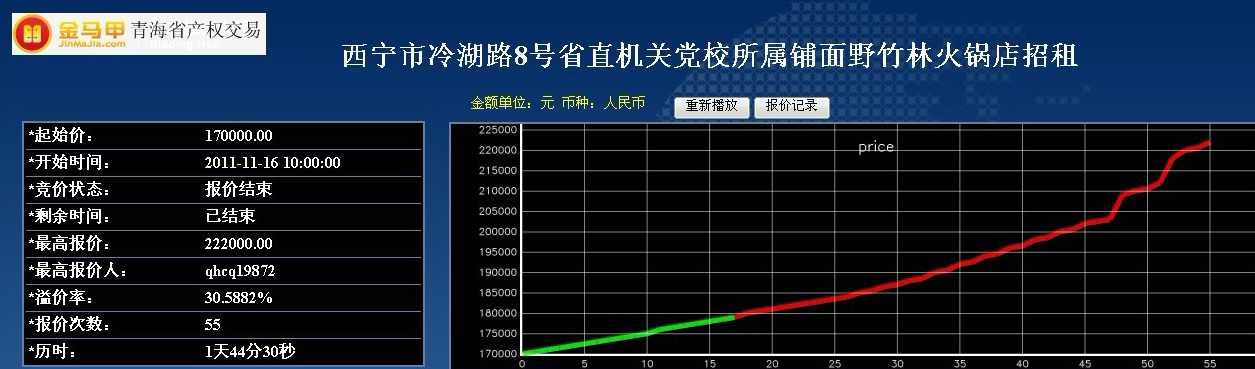 2011年11月23日10时44分55秒,随着最后一个商铺在金马甲网络竞价大厅里限时竞价倒计时归零,全省行政事业单位房屋租赁第一个项目—省直机关党校商铺出租网络竞价完美谢幕,网络竞价结果为:5个铺面最后竞出56.17万元的高价,是原租赁价格20万元的2.8倍。