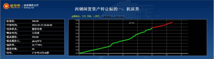 此次活动共有52位竞买人参加网络竞价,起拍价为3600000.00元整,经过64次报价,最终以5500000.00元整成交,项目增值率达52.7%