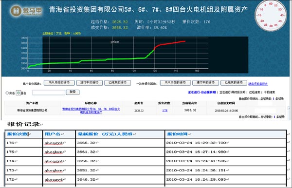 3月24日,我市场启用全国产权网络竞价系统---金马甲(与全国产权机构共建,投资3010万元),对青海省投资集团有限公司火电机组项目实施异地网络竞价,8位竞买人在2个半小时内,竞价176轮、延时68次,最终以3666.32万元成交,实现资产增值1040万元,增值率达39.6%,获得了极大成功!