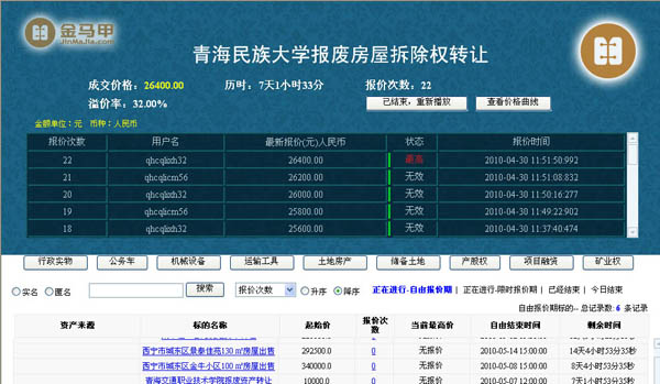 4月30日,青海民族大学报废房屋拆除权转让项目在我市场的共享网站——金马甲进行了7天的网络动态报价之后,最终以2.64万元成交,较评估价2.02万元增值了6200元,增值率达32%。