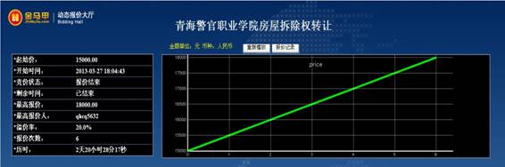 我市场闲置部专业团队对公物仓委托的每宗资产都认真负责,在接受委托后,为了充分发掘资产的潜在价值,使该资产在转让过程中能够实现价值最大化。市场闲置部门成立了专业的项目组人员前往现场对拆迁大楼进行核实、拍照,市场工作人员根据西宁拆除项目的普遍价位,将项目资料图文并茂的发布到市场网站进行宣传,在公告发布短短5天的时间内共征集到意向受让人15家以上,来电或现场咨询60多人次,市场工作人员主动放弃节假日休息时间带领意向受让人前往现场带看。经过市场审核确认,最终筛选出10家符合条件的意向受让人参加此次拆迁项目的网络竞价。2013年3月30日上午该项目网络竞价正式开始,在短短2小时28分17秒时间里,以委托价15000元起,经过多轮激烈的竞价,最终以18000元成交,增值3000元,增值率达20%。