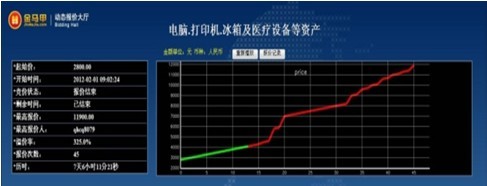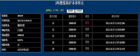 2012年10月25日,我市场对青海省团校一台2吨燃煤锅炉本体进行了成功处置,该资产的评估价为4000元,经过2小时12分,经过33轮的网络动态报价,最终以20800元的价格成交,实现增值16800元,增值率高达420%。