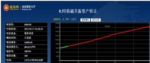 6月19日,在经过100次紧张而激烈的网络竞价后,青海大学附属医院0.5T核磁共振资产转让项目最终以16800元的成交价完美谢幕,比挂牌价6000元增值10800元,增值率达160%,增值率再获突破。