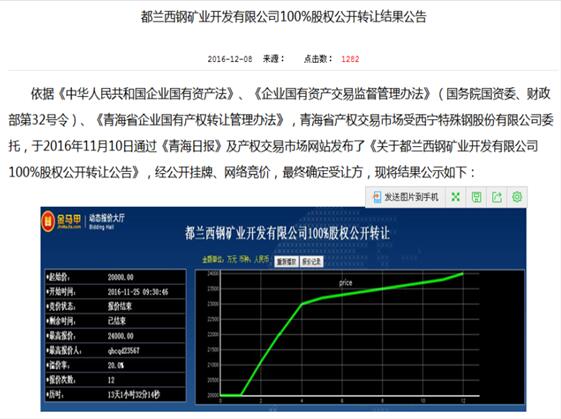 2016年11月,都兰西钢矿业开发有限公司将其持有的100%股权公开转让,经过激烈竞价后,最终由甘肃中房国创实业有限公司以高于挂牌价20%的价格竞标,项目成交价为2.4亿元,比挂牌价高出0.4亿元,保留了上市企业的品牌影响力和资金优势,又引入了民营资本灵活高效的管理和投资决策机制,有效提升了公司的投资效率和竞争活力。