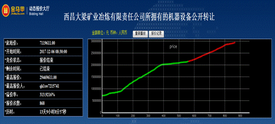 我市场利用自主研发的全国实物资产交易信息平台和覆盖全省、面向全国的网络交易平台,针对该闲置设备进行精心准备策划,发挥大数据功能,调取后台千万客户信息(市场近十年客户数据累计),进行专项推送。引发了全国各知名网站的关注,形成了轰动效应,成功征集到近百名意向受让方参与报名,交易保证金达1.8亿(每人200万),通过全国产权交易机构电子网络竞价联盟平台(金马甲)进行网络拍卖。