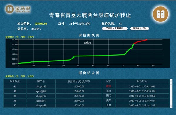 2010年8月5日,我市场对青垦大厦两台燃煤锅炉进行了成功处置。该批资产的评估价为10万元。经过21小时22分、41轮的网络动态报价,最终以12.5万元的价格成交,实现增值2.5万元,增值率达25%。