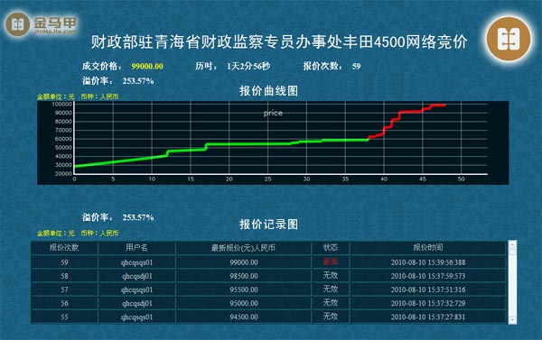 89日,我市场受财政部驻青专员办的委托,对其拥有的丰田4500型越野车进行公开处置。受到委托后,我市场高度重视,成立了由相关部门领导、转让方和我市场工作人员等组成的项目工作组,对整个交易过程进行全程监督。同时利用网站和其它媒体充分披露信息,通过市场主网站及车辆超市对该标的进行公开挂牌,短时间内迅速征集到16名意向受让人,经过严格审核,最终确定了10名意向受让人。为充分体现“公开、公平、公正”和“诚实信用”的交易原则,通过与转让方沟通,决定采用网络报价的方式进行处置。810日,10名意向受让人经过1天、59轮的报价,最终以9.9万元的价格成交,比评估价2.8万元增值了7.1万元,增值率高达253.57%,获得了极大的成功。