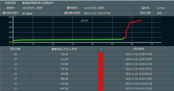 挂牌期间,市场利用报刊、网络等多种手段进行信息披露,同时还在以往的客户群中寻找潜在意向受让方,并针对该项目的特点,进行详细介绍、重点推介,力争寻求到更多的受让方。缜密有效的前期准备工作取得了预期的效果,截至挂牌期满,共征集到符合条件的意向受让方4家。11215,网络竞价正式开始。4位竞买人在1小时12分钟内,竞价20轮,延时15次,最终以520万元的价格成交,实现增值200万元,增值率达62.50%