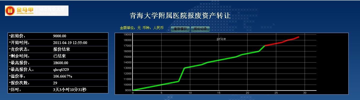 受青海省省级行政事业单位国有资产公物仓委托,青海省产权交易市场于2011年4月19日,对青海大学附属医院一批报废设备资产(项目编号GC11QH030013)实行公开网络竞价处置。