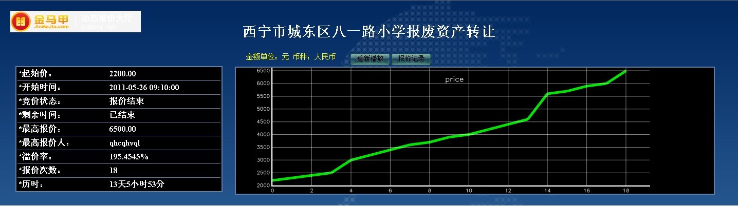 此次活动共有11位竞买人参加网络竞价,起拍价为2200.00元,经过18次报价,最终以6500.00元成交,项目增值率195.45%。