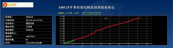 此次活动共有11位竞买人参加网络竞价,起拍价为35000.00元,经过83次报价,最终以87000.00元成交,项目增值率148.57%