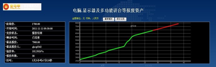 此次活动共有10位竞买人参加网络竞价,起拍价为2700.00元,经过38次报价,最终以7900.00元成交,项目增值率193%