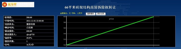 此次活动共有3位竞买人参加网络竞价,起拍价为500.00元,经过1次报价,最终以600.00元成交,项目增值率20%