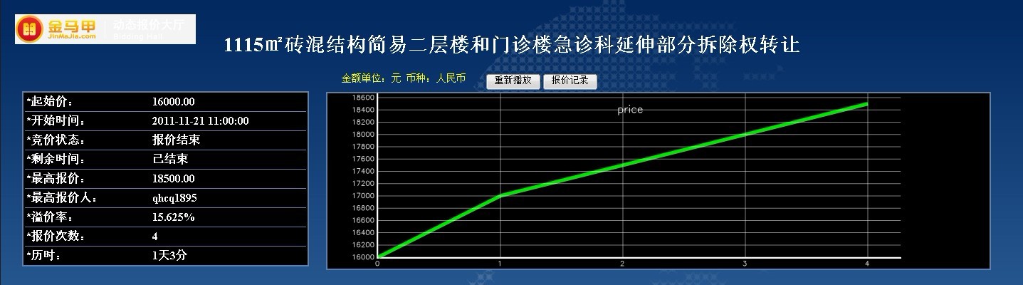 此次活动共有3位竞买人参加网络竞价,起拍价为16000.00元,经过4次报价,最终以18500.00元成交,项目增值率16%