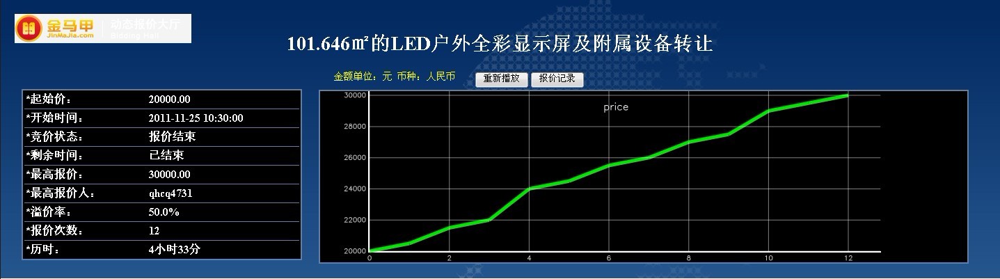 此次活动共有3位竞买人参加网络竞价,起拍价为20000.00元,经过12次报价,最终以30000.00元成交,项目增值率50%