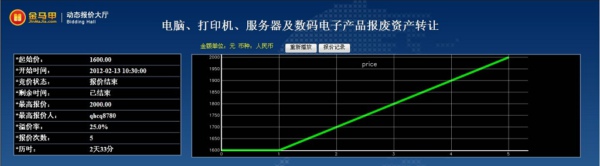 此次活动共有6位竞买人参加网络竞价,起拍价为1600.00元,经过5次报价,最终以2000.00元成交,项目增值率25%