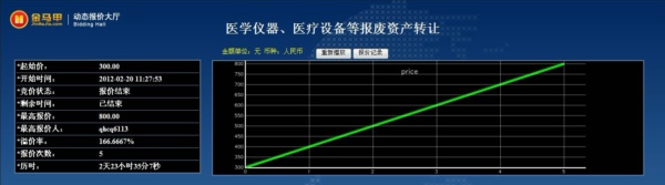 此次活动共有5位竞买人参加网络竞价,起拍价为300.00元整,经过5次报价,最终以800.00元整成交,项目增值率高达167%。