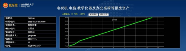 此次活动共有12位竞买人参加网络竞价,起拍价为7000.00元整,经过15次报价,最终以8600.00元整成交,项目增值率达23%。
