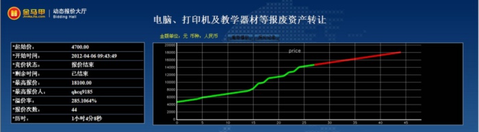 此次活动共有13位竞买人参加网络竞价,起拍价为4700.00元整,经过44次报价,最终以18100.00元整成交,项目增值率达285.0%。