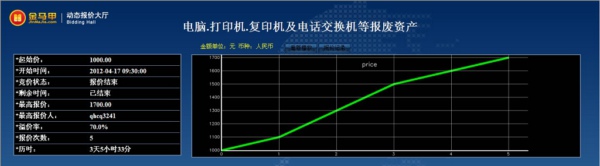 此次活动共有8位竞买人参加网络竞价,起拍价为1000.00元整,经过5次报价,最终以1700.00元整成交,项目增值率达70.0%