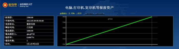 此次活动共有1位竞买人参加网络竞价,起拍价为1500.00元整,经过1次报价,最终以1600.00元整成交,项目增值率达6.67%。