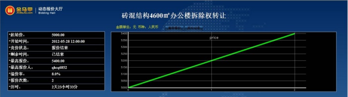 此次活动共有5位竞买人参加网络竞价,起拍价为5000.00元整,经过2次报价,最终以5400.00元整成交,项目增值率达8.0%