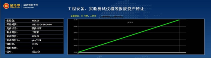 此次活动共有6位竞买人参加网络竞价,起拍价为8000.00元整,经过1次报价,最终以8100.00元整成交,项目增值率达1.25.0%。