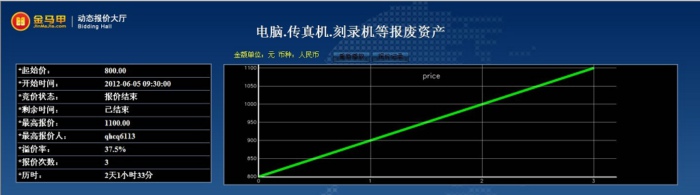 此次活动共有4位竞买人参加网络竞价,起拍价为800.00元整,经过3次报价,最终以1100.00元整成交,项目增值率达37.5%。