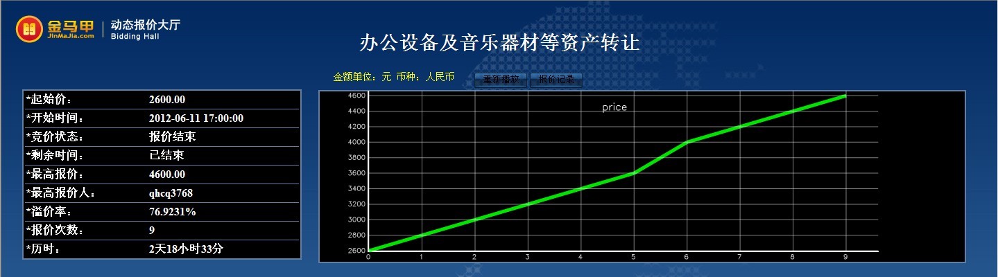 此次活动共有7位竞买人参加网络竞价,起拍价为2600.00元整,经过9次报价,最终以4600.00元整成交,项目增值率达76.92%。