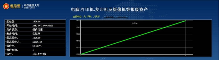此次活动共有4位竞买人参加网络竞价,起拍价为1500.00元整,经过1次报价,最终以1600.00元整成交,项目增值率达6.67%。