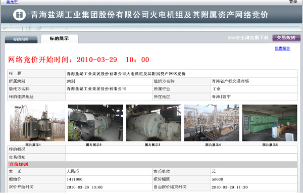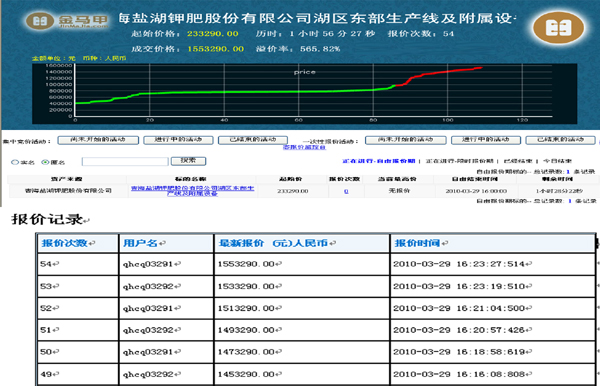 3月29日上午10时,青海盐湖工业集团火电机组及其附属资产的网络竞价开始。14个竞买人在各自的网络竞价室开始报价。竞价一开始就显得非常激烈,短短30分钟,价格就由评估价141万元飙升至566万元。短暂的沉寂之后又出现竞价高潮,在1个半小时的自由竞价阶段已达到716.1万元的高价。接下来的限时竞价阶段更是扣人心弦,各竞买人互不相让,竞价达到了白热化,经过65次激烈争夺,竞价最终定格于886.1万元,增值率达到了528%。