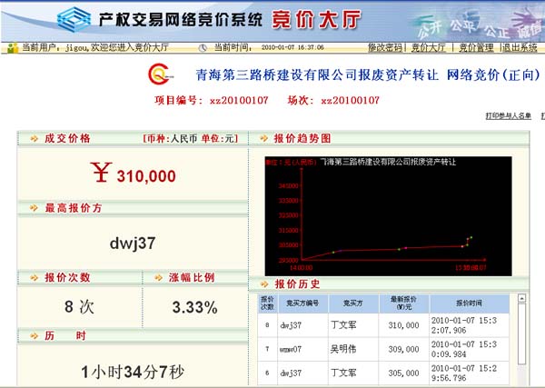 青海第三路桥建设机械工程有限公司报废资产公开处置在青海产权交易市场的的操作成功,充分证明了市场引进的新的网络竞价系统的优势——那就是能够为受让双方提供更为方便、快捷、高效的服务