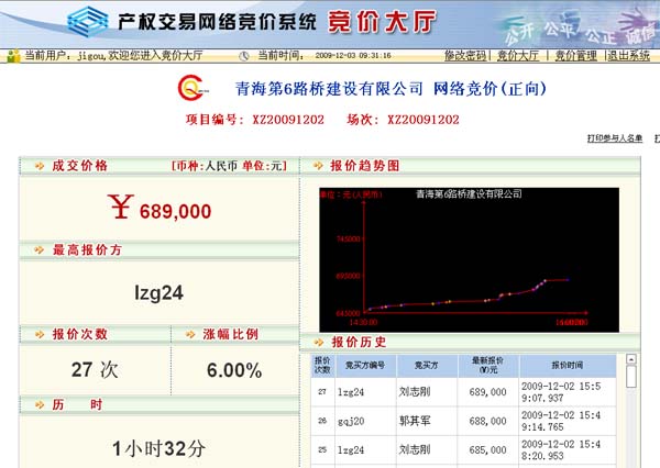 青海第六路桥建设有限公司相关负责人亲临市场竞价现场,对网络竞价全过程进行了实时监督。此次活动共有24位竞买人参加网络竞价,起拍价为650000元,最终经过27次竞价,历时1小时32分,以689000元成交,项目增值率6%。青海第六路桥建设有限公司到场领导对青交市场的工作给予了充分肯定和高度评价。此次项目的成功操作,再次体现了青海产权交易市场为国有资产保值、增值的强大功能。