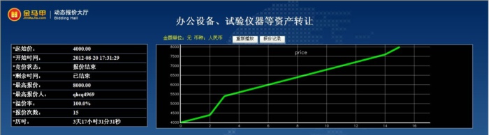 此次活动共有12位竞买人参加网络竞价,起拍价为4000.00元整,经过15次报价,最终以8000.00元整成交,项目增值率达100.0%。