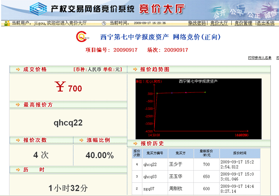 西宁市第七中学报废资产公开处置在青海产权交易市场的的操作成功,充分证明了市场引进的新的网络竞价系统的优势——那就是能够为受让双方提供更为方便、快捷、高效的服务。