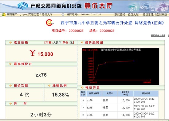 西宁市第九中学五菱之光车辆出售在青海产权交易市场的的操作成功,充分证明了市场引进的新的网络竞价系统的优势——那就是能够为受让双方提供更为方便、快捷、高效的服务。