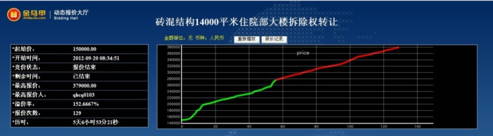此次活动共有12位竞买人参加网络竞价,起拍价为150000.00元整,经过129次报价,最终以379000.00元整成交,项目增值率达153.0%