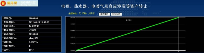 此次活动共有1位竞买人参加网络竞价,起拍价为60000.00元整,经过1次报价,最终以60100.00元整成交,项目增值率达0.0%。