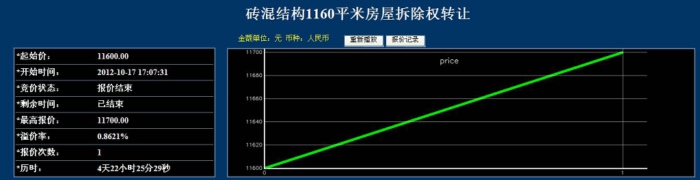 此次活动共有5位竞买人参加网络竞价,起拍价为11600.00元整,经过1次报价,最终以11700.00元整成交,项目增值率达1.0%。