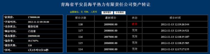 受平安县财政局委托,青海省产权交易市场于2012年11月13日对平安县海平热力有限责任公司七台燃煤锅炉及附属设备、柳工装载机、办公设备等资产转让(项目GC12QH030139 )实行公开网络竞价处置。