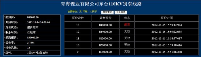 青海锂业有限公司东台110KV别东线路及部分材料资产转让竞价成功