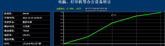 此次活动共有11位竞买人参加网络竞价,起拍价为300.00元整,经过4次报价,最终以750.00元整成交,项目增值率达150.0%。