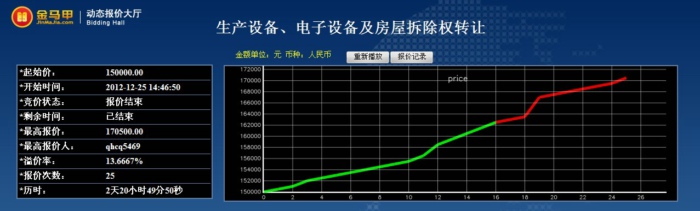 此次活动共有7位竞买人参加网络竞价,起拍价为150000.00元整,经过25次报价,最终以170500.00元整成交,项目增值率达14.0%。