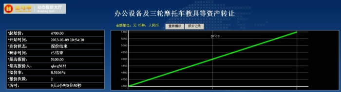 此次活动共有4位竞买人参加网络竞价,起拍价为4700.00元整,经过2次报价,最终以5100.00元整成交,项目增值率达9%。