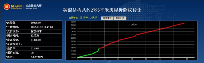 此次活动共有3位竞买人参加网络竞价,起拍价为10000.00元整,经过78次报价,最终以31200.00元整成交,项目增值率达212%。
