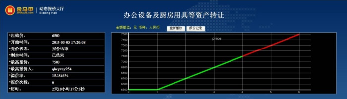 此次活动共有7位竞买人参加网络竞价,起拍价为6500.00元整,经过6次报价,最终以7500.00元整成交,项目增值率达15.0%。